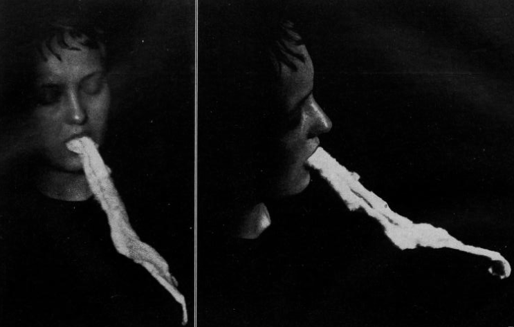 Witnesses swore it was the very fabric of the spirit world, pushed into ours through human flesh. Photographs from the era show people slumped in half-conscious states, thin sheets of material spilling from their faces like spectral laundry. The effect is unsettling even now — not because it looks real, but because it doesn’t.